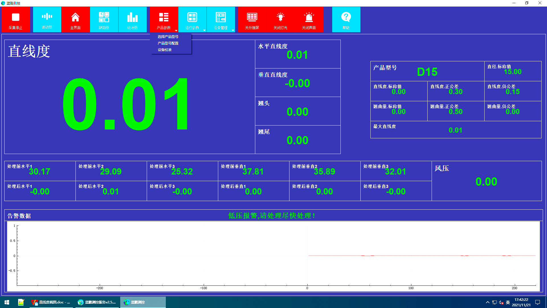 产品参数具备三项功能:选择产品型号、产品型号配置、设备校准。主要是用于直线度测量仪的校准与设置被测产品的基础信息。