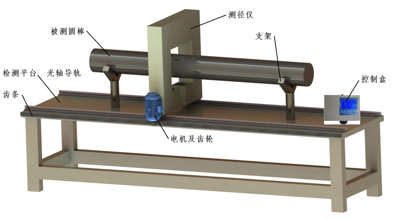 圆棒扫描式测径仪整套设备主要由测径仪、控制盒、平台、支架、光轴滑块副、滑台、传动机构、电机等组成。
